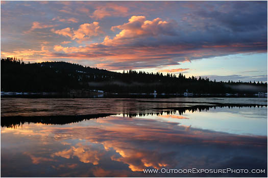 Symmetrical reflections in the frozen surface of Hyatt Lake on a crisp winter morning in the Cascade Mountains above Ashland, Oregon.