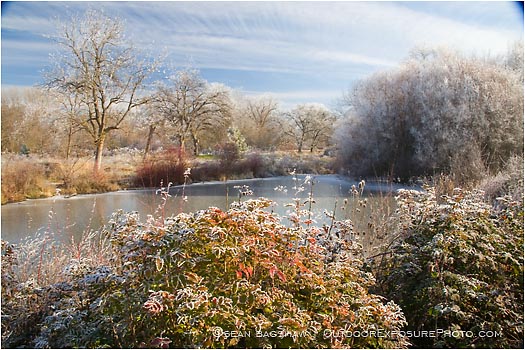 An ice covered pond lined with trees and bushes in winter.