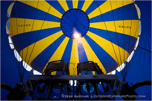 balloon, balloons, California, festival, hot air balloon, montague, Montague Balloon, rally, blue, yellow, inside, inflating, horizontal, color image, torch, flame, heat, blowing up, strings, looking up