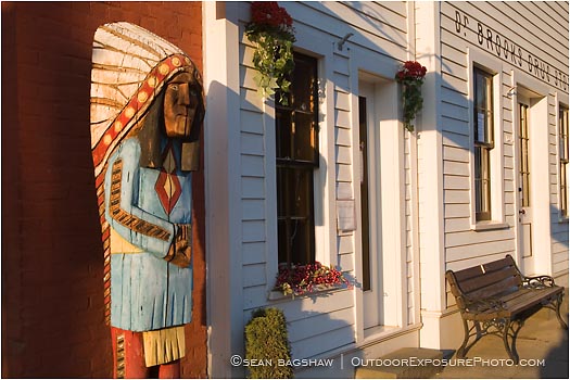 jacksonville, southern, oregon, sunrise, risings sun, early, dawn, morning, street, town, city, historic, western, stores, buildings, glowing, quiet, store fronts, signs, horizontal, color image, wooden, statue, indian, tribal, native american, bench