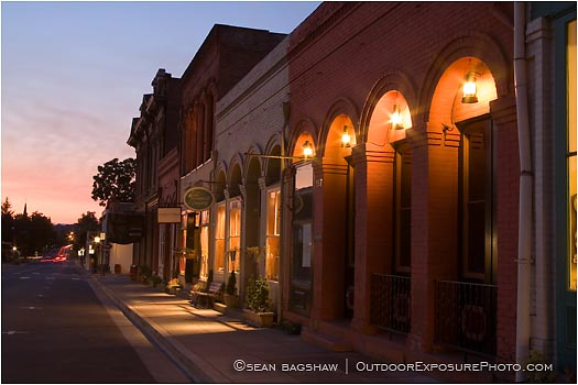 Stores line the street in historic Jacksonville at sunrise in Southern Oregon.
