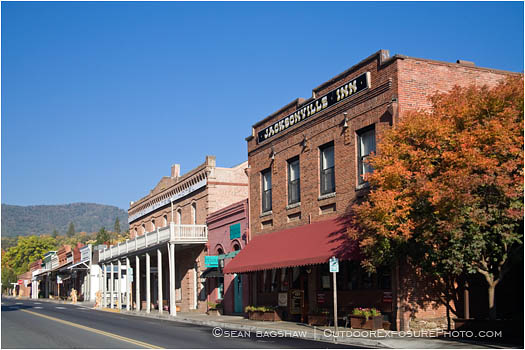 Historic buildings, including the Jacksonville Inn, line the street in Jacksonville, Oregon.