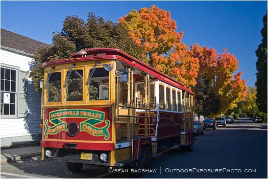 The old Trolley of Jacksonville, Oregon still runs the streets with vibrant fall colors surrounding the area.