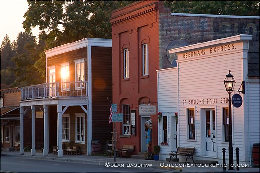 jacksonville, southern, oregon, sunrise, risings sun, early, dawn, morning, street, town, city, historic, western, stores, buildings, glowing, quiet, store fronts, signs, horizontal, color image