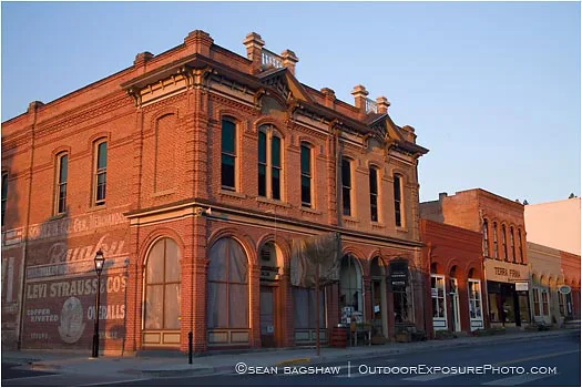 Stores line the street in historic Jacksonville at sunrise in Southern Oregon.