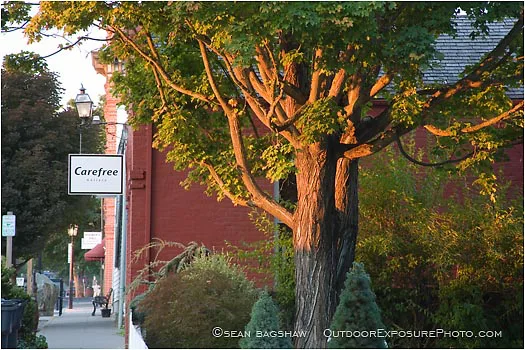 jacksonville, southern, oregon, sunrise, risings sun, early, dawn, morning, street, town, city, historic, western, stores, buildings, glowing, quiet, store fronts, signs, horizontal, color image, tree, trees