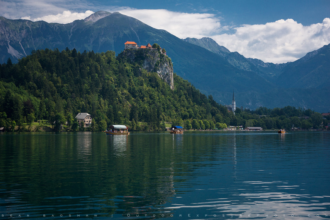 A view across Lake Bled, Slovenia, looking up at Bled Castle.