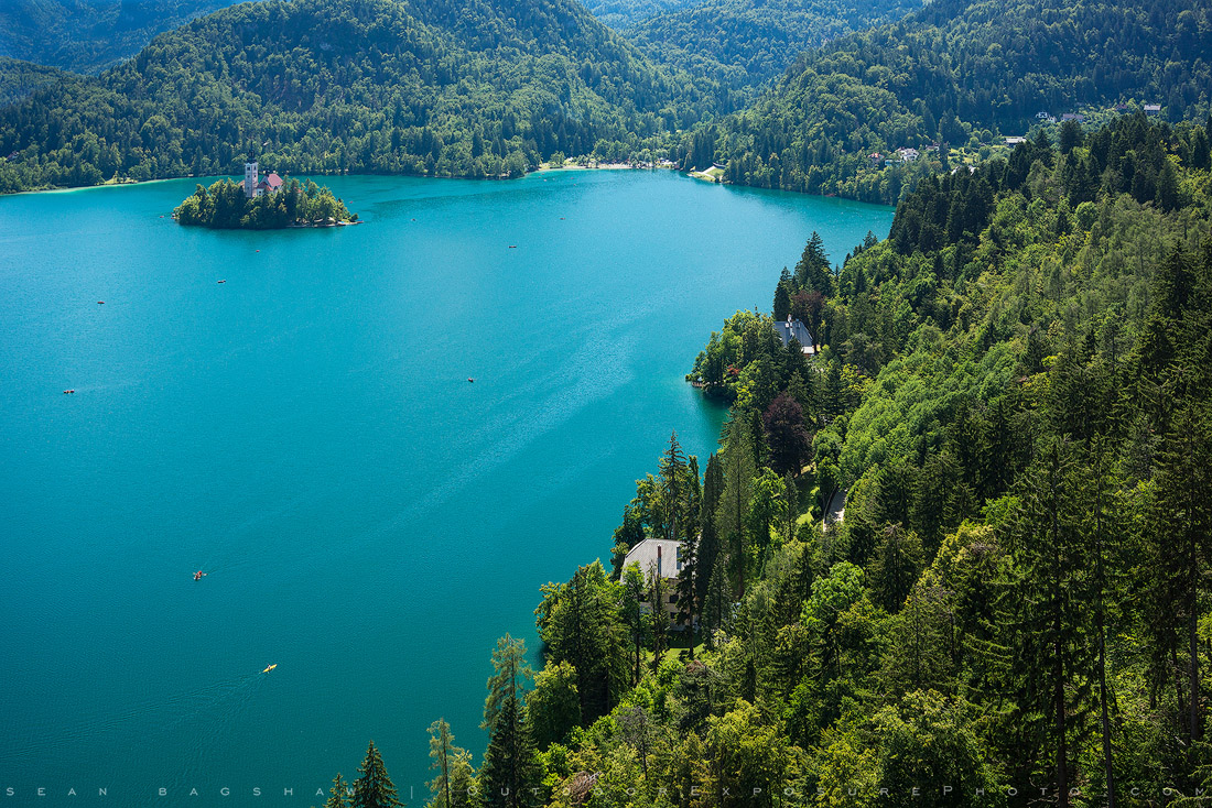 A view from high atop Bled Castle across Lake Bled, Slovenia.