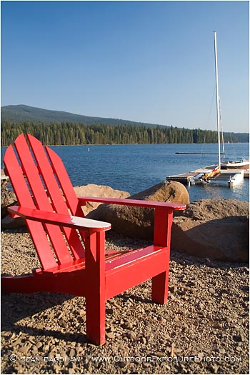 Red Andirondack chair at the resort at Lake of the Woods in Southern Oregon.