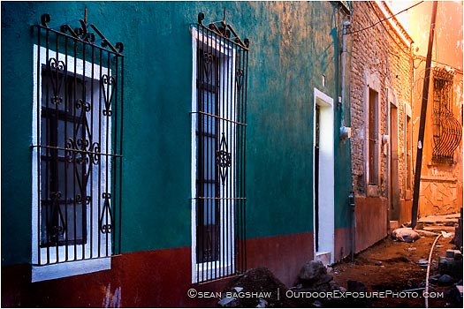 lamp, lit, callejon, guanajuato, mexico, alley, dirty, trash, windows, bars, iron, glow, buildings, vibrant, horizontal, color image, quiet, alleyway