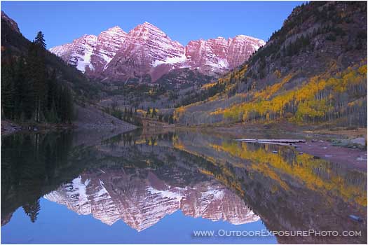 maroon, bells, reflection, mirror, elk mountains, colorado, snow capped, symmetry, trees, dawn, sunrise, morning, first light, aspens, forest, horizontal, color image, lake, water