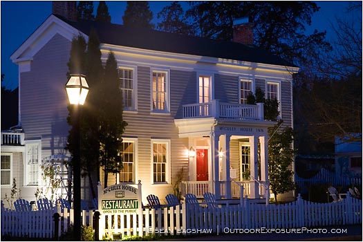 The McCully House lit up on a fine evening in Jacksonville, Oregon.