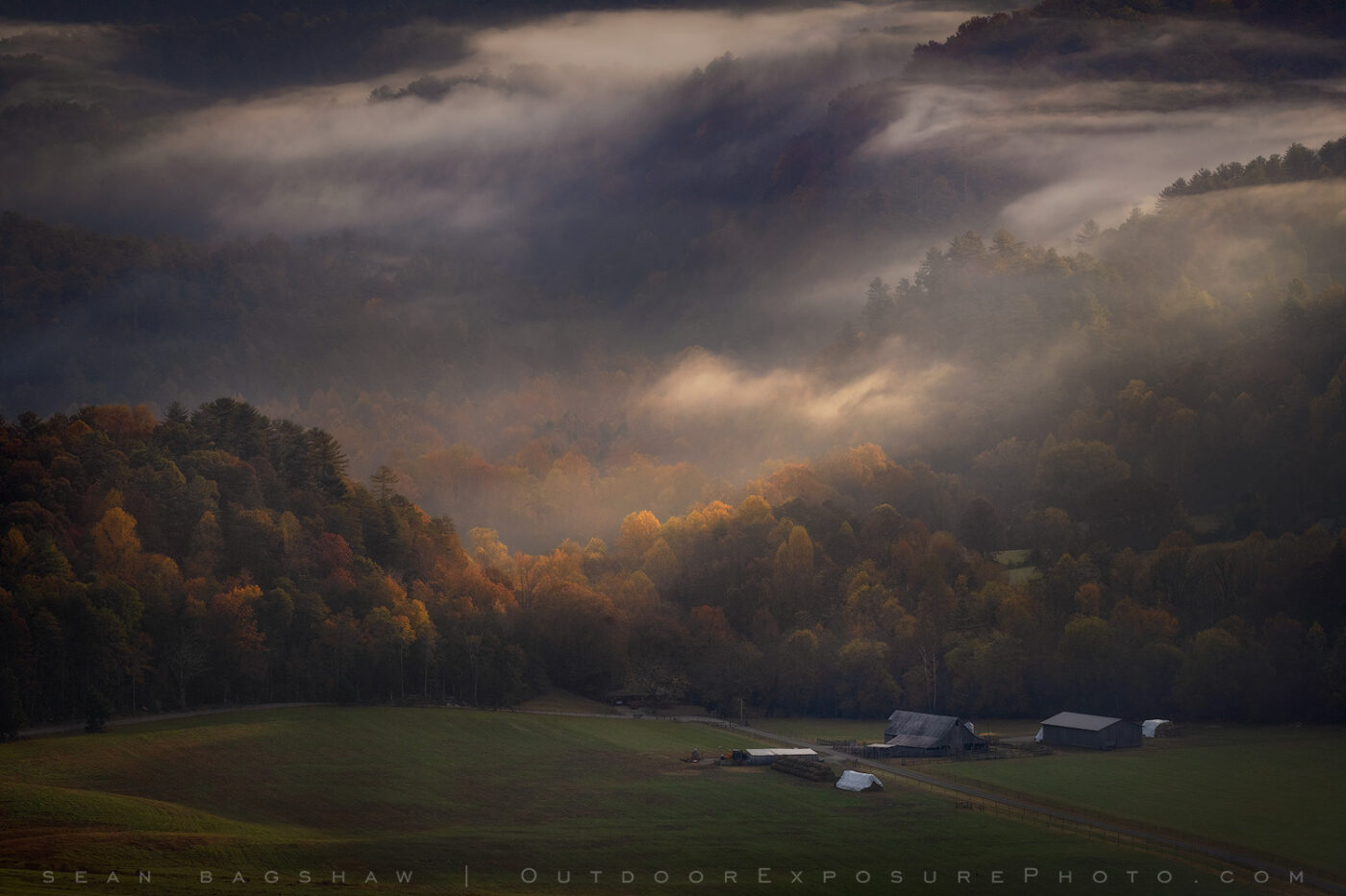 On this misty autumn morning in Tennessee, Millers Cove appears like a tranquil painting, wrapped in gentle fog and autumn charm.
