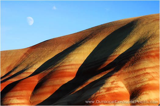 painted hills, hills, john day fossil beds, national monument, wheeler, oregon, colorful, close up, vibrant, detail, texture, layers, horizontal, color image, moon, half, over, hanging