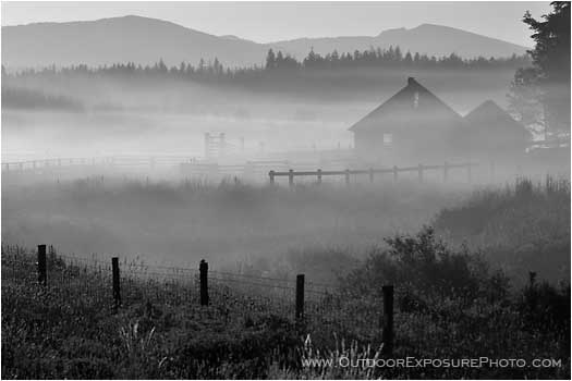 An old ranch house enveloped in fog on a cool summer morning at Howard Prairie along Dead Indian Memorial Highway in the southern Oregon Cascades.