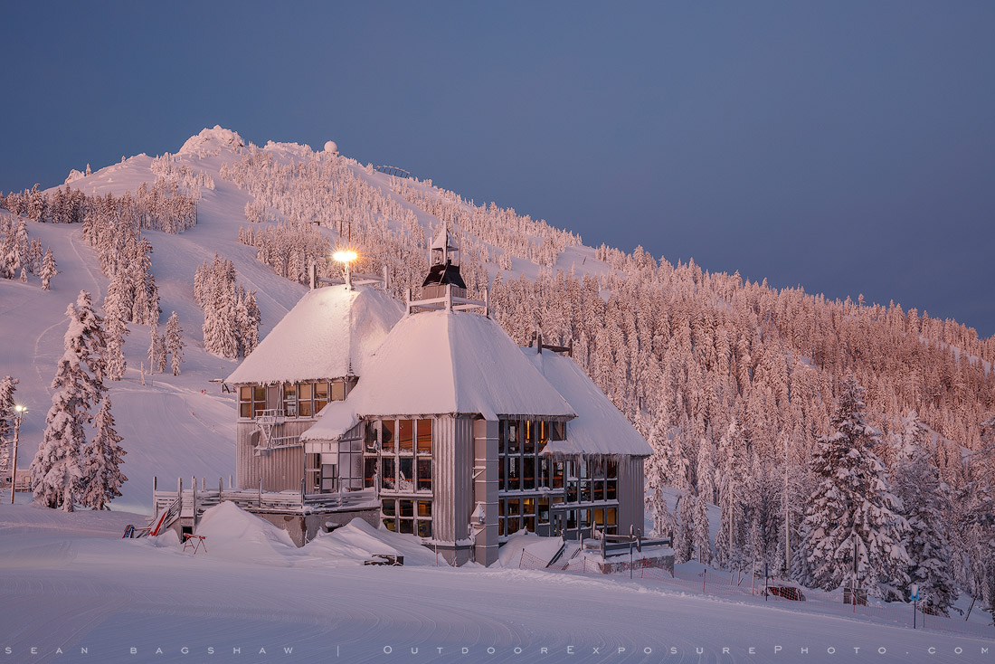 Fresh snow on the lodge at Mt. Ashland ski area.