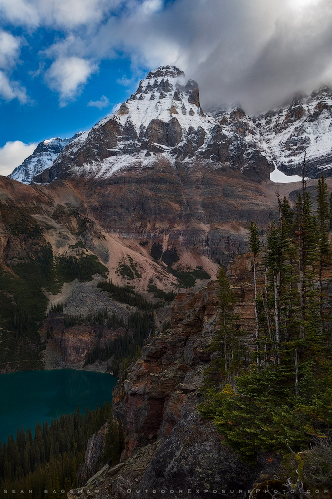 Mt. Huber is one of the seven 11,000 feet peaks in Lake Louise/O’Hara group. It’s the lowest on the list by elevation but looks equally impressive when viewed from Lake O’Hara. It appears like a giant towering rock buttress in front of the jagged ridge of Mt. Victoria. The standard route up this mountain involves Class 4 scrambling on Huber Ledges, a short glacier crossing and then steep snow climbing on the upper mountain.