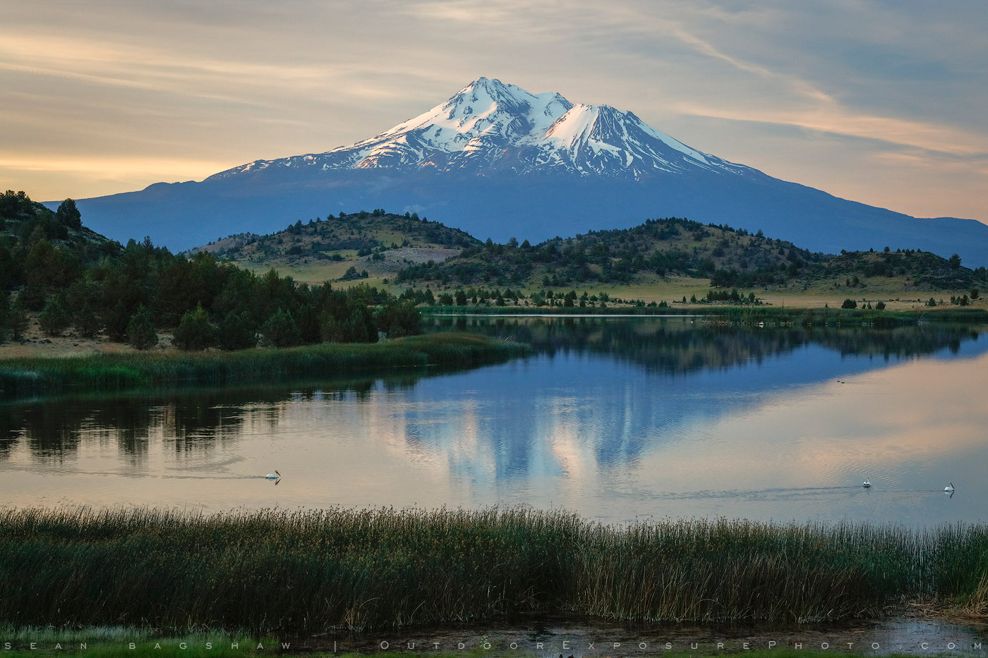 The regal Mount Shasta reflected in the waters of Trout Lake, in the Shasta Valley Wildlife Refuge.