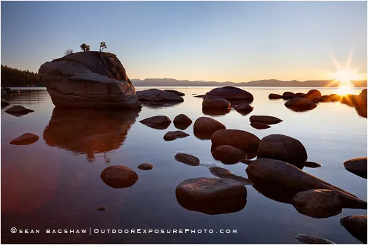 Nevada; Tahoe; bonsai rock; lake; reflection; rocks; sun star; sunset; water