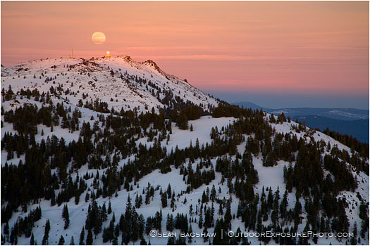 Mt. Ashland with a full moon over it at sunset in the Siskiyou Mountains in Southern Oregon.