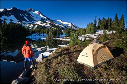 2009, backpacking, ice, Jefferson Park, lake, melt, mountain, Mt. Jefferson, Oregon, snow, volcano, volcano* cascade range, wilderness, tarn, reflection, mirrored, rocks, stones, horizontal, color image, snow capped, trees, pond, backpacker, hiker, camper, camp, tent, overlooking, under, shoreline, beside, standing, one, 1, individual, lonely, awe