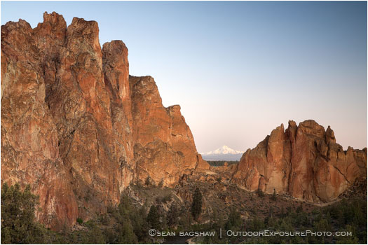 Mount Jefferson can be seen from in between Asterik Pass in Smith Rock State Park in Oregon.