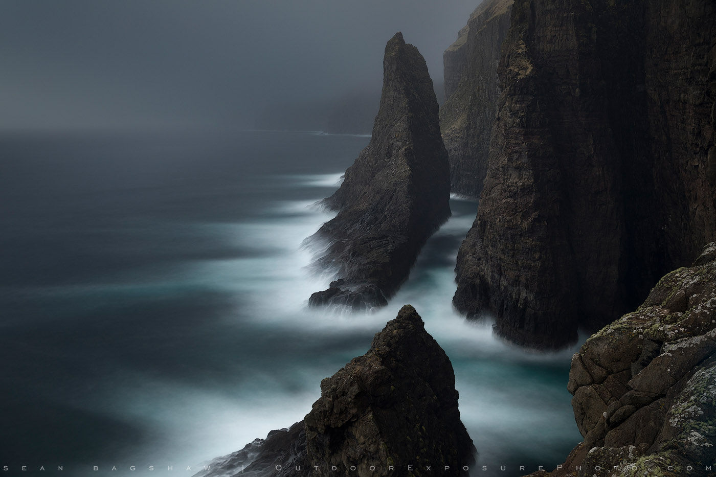 While hiking along the massive sea cliffs on the Island of Vagar, I came across what I think is one of the most ominous seascapes I’ve ever seen, made more so by the deep fog.