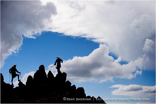 top, mt. lassen, volcano, volcanic, cascade range, northern, california, shasta, mount, mountain, mountains, lassen peak, lava dome, national park, rocks, rock, stones, people, pair, 2, two, climbing, climbers, hiking, hikers, silhouettes, blue sky, clouds, hats, horizontal, color image