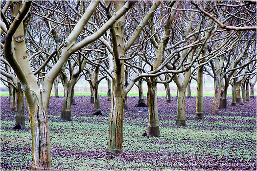 purple, green, orchard, layers, row, rows, chico, california, trees, bare, trunks, twisted, interlocking, horizontal, color image