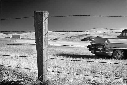 black and white, b&w, fence, barb wire, wire, stake, post, car, abandoned, left, antique, rustic, pasture, field, horizontal