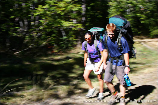 backpackers, backpacking, backpack, packing, hiking, walking, trail, couple, two, 2, people, panning, movement, sunny, forest, bag, bags, back pack, horizontal, color image