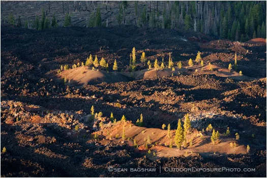 2009, California, cinder cone, geology, Lassen Volcanic National Park, lava flow, Mt. Lassen, painted dunes, volcanic activity, volcano, mountains, mountain, hills, national park, dirt, soil, orange, sunrise, rising sun, morning, early, dawn, day break, horizontal, color image, dunes, minerals, layers, colorful, trees, vibrant, spotted, scattered