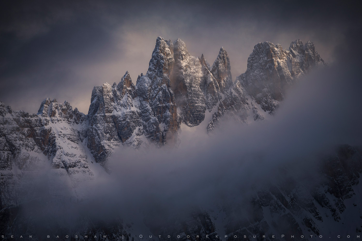 The entire trip to the Dolomites was like a winter dream. The clouds would move in and out all day, creating dramatic light and opening momentary windows to jagged peaks.