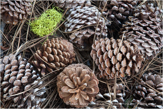 California, pine, pine cone, pine needles, ponderosa, close up, detail, scales, seeds, cone, pattern, texture, colorful, horizontal, color image, standing out, bundle, green, vibrant, out of place