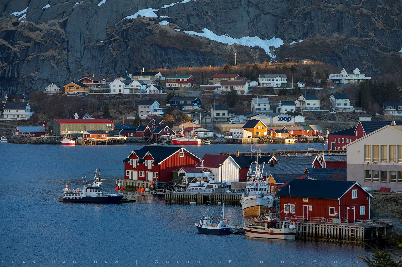 Morning light touches the harbor of Reine in the Lofoten Islands of Norway.