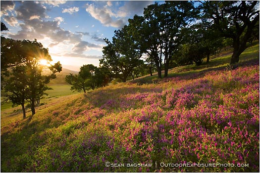 The sun sets through a wise oak tree, providing a peek at a sun star and illuminated purple vetch in the process.