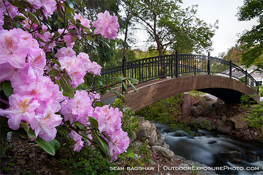 A Rhododendron bush grows by one of the bridges over Ashland Creek running through Lithia Park in Ashland, Oregon.