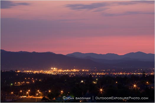 This stock photo contains the subjects Rogue Valley, Medford, sunset, night, city lights, lights.