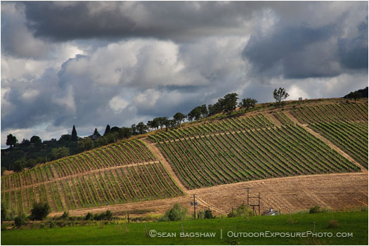 The straight rows of the vineyard at RoxyAnn Winery in Medford, Oregon.