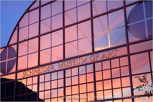 The sunrise is reflected in the panes of glass at the Schneider Museum of Art on the SOU campus.