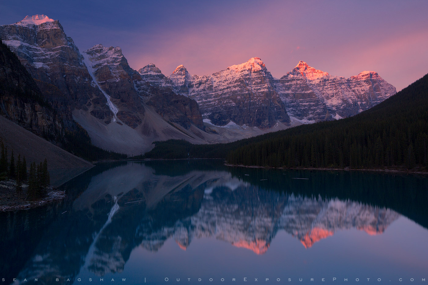 Moraine Lake, just up the road from Lake Louise, offers never ending possibilities for photography. I was able to frame 7 of the 10 peaks in this frame, and love the talus slopes that descend into the lake.