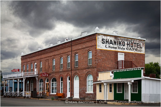 frontier, ghost town, old west, Oregon, Shaniko, wasco county, us route 97, town, western, historic, district, hotel, cafe, buildings, storm, stormy, clouds, dark, depressing, abandoned, quiet, horizontal, color image