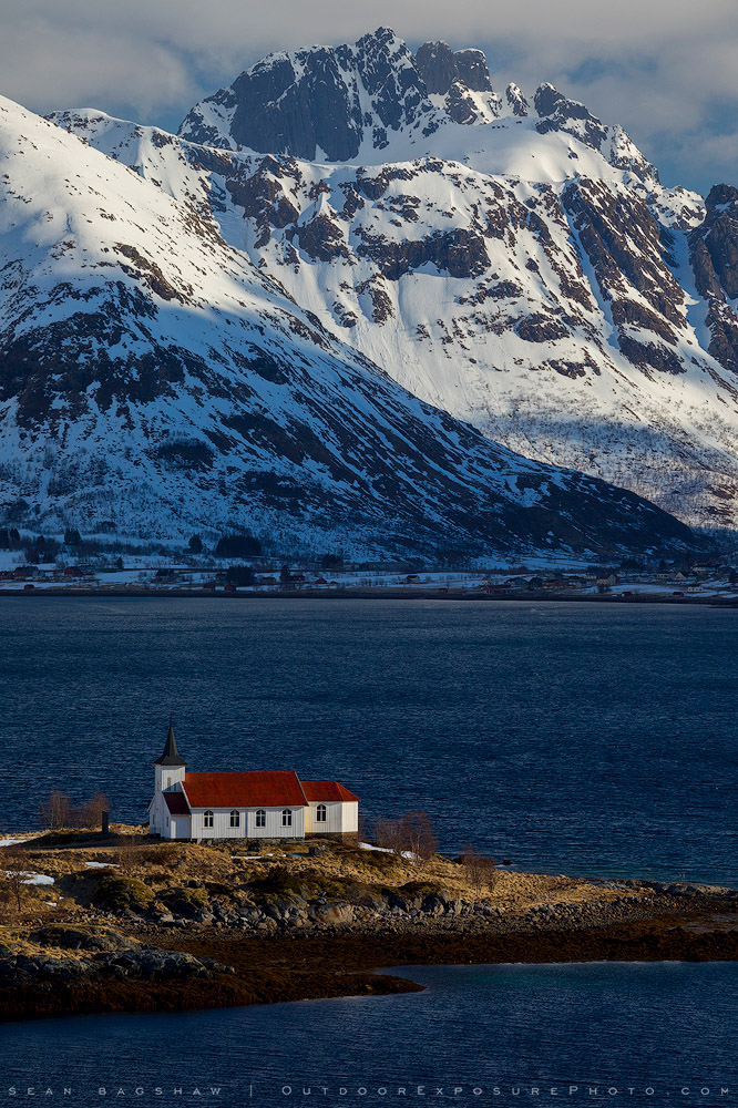 The illuminated Sildpollnes Church looks out over the waterways beween the Lofoten Islands of Norway.