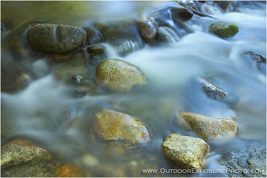 A simple image of silky water running in between and over shiny rocks along the way.