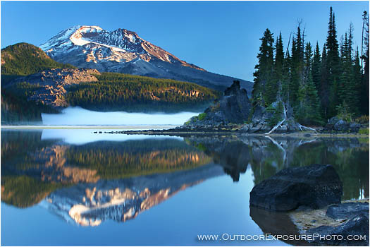 south, sister, symmetry, reflection, mirror, mountain, cascades, central, Oregon, lake, water, rocks, sunrise, horizontal, color image