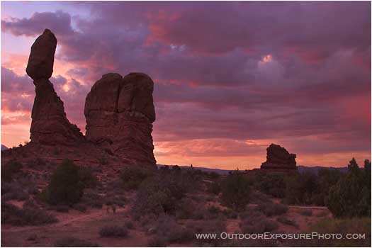 balanced rock, arches national park, grand county, Utah, stone, stones, rocks, rock, plants, vegetation, tree, green, desert, dry, orange, perched, looking up, horizontal, color image, storm, morning, early, sunrise, stormy, clouds