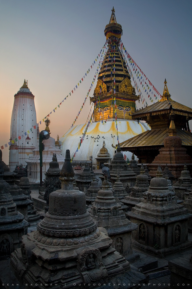 The gilded tower atop the Swayambhunath Stupa, also known and the Monkey Temple, glows in the early morning light.