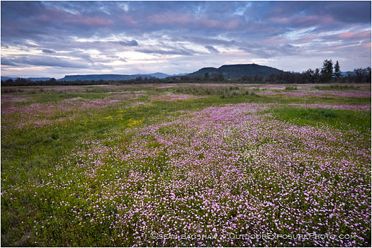 Table Rock overlooks a field of pink wildflowers in Medford, Oregon.