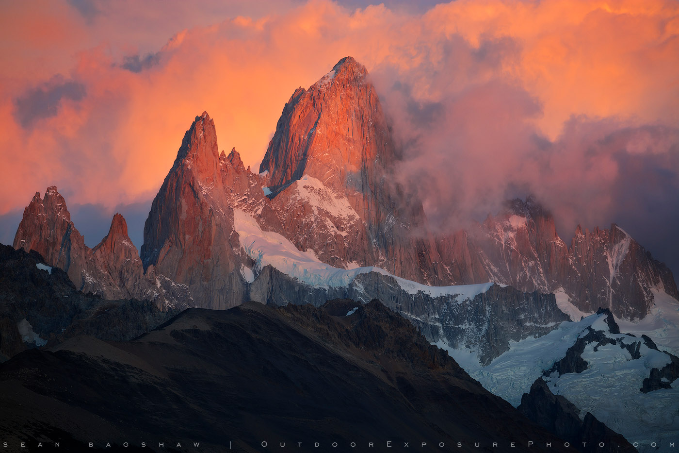 This is El Chalten which means Smoking Mountain in Tehuelche, the language of the ancient nomadic hunters who lived in this part of Patagonia. They named it so because the mountain is almost always shrouded in cloud. We spent three days here and were very fortunate to have clear views each day. But this, the morning of our second day, was by far the most spectacular.