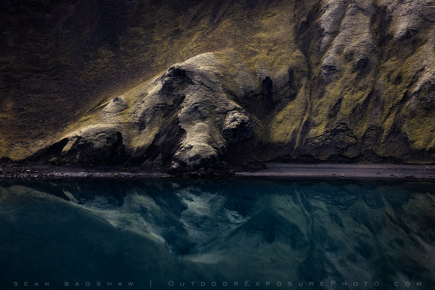 A mesmerizing reflection of moss-laden lava rock in still blue water. Ljótipollur Lake is at the bottom of a volcanic crater in the Iceland Highlands.